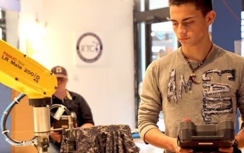 In The Classroom: Students can earn up to 12 college credits and industry certifications while taking courses on robot operations and electrical concepts, including tasks required to set up specific applications and test, run, and refine programs.